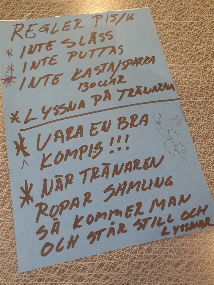 Tja gänget. För två träningar sen så samlade vi killarna i ringen och kom överens om vilka regler vi ska ha i laget för att alla ska känna sig trygga och välkomna. Jag kommer spalta upp reglerna som killarna kom fram till. Vi ledare vill att ni innan nästa träning tar några minuter och påminner killarna om vad som gäller. ORDNINGSREGLER P15/16 * INTE slåss. * INTE puttas. * INTE kasta/sparka iväg bollar. * Lyssna på tränarna. * Vara en bra kompis. * När tränarna ropar samling så kommer man till samlingen och står still och lyssnar. Vi kommer i framtiden bli betydligt hårdare mot alla former av slag, sparkar, knuffar och hot för att alla ska känna sig trygga 💪💚⚽. /Ledartrojkan
