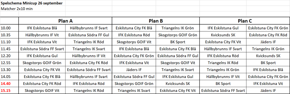 Lag svart: Zdeslav (ledare), Lucas, Vincent, Max, Henry, Alexander, Udai, Aston 11.45 Plan A Eskilstuna Södra FF Svart - Triangelns IK Svart 13.30 Plan B Jäders IF - Triangelns IK Svart 15.15 Plan B Triangelns IK Svart Eskilstuna City FK Vit Lag röd: Dennis (ledare), Ted, Sixten, Hannes, Jack, Ebbe, Alexander K, Oliver L 11.10 Plan A IFK Eskilstuna Vit - Triangelns IK Röd 12.55 Plan C Triangelns IK Röd - BK Sport 15.15 Plan A Skogstorps GOIF Vit - Triangelns IK Röd Lag grön: Johan (ledare), Oliver J, Douglas, Måns, Leon, Jonathan, Alvin, Muzamil 10.00 Plan B Eskilstuna City FK Blå - Triangelns IK Grön 11.45 Plan C Hällbybrunns IF Svart - Triangelns IK Grön 13.30 Plan C Triangelns IK Grön - IFK Eskilstuna Blå Samling 20 minuter innan första matchstart. Uppvärmning inför matcher får ske på yta bakom de uppkritade matchplanerna. Ca 5 minuter före matchstart får spelande lag tillgång till matchplan. Matcher 2x10 min. Plats: Balsta. Det kommer finnas möjlighet att köpa korv, festis, fika och liknande. Vi påminner om att stanna hemma vid symtom på covid-19, att vara noga med handhygien och att hålla avstånd till andra människor och undvika trängsel. Heja Triangeln!